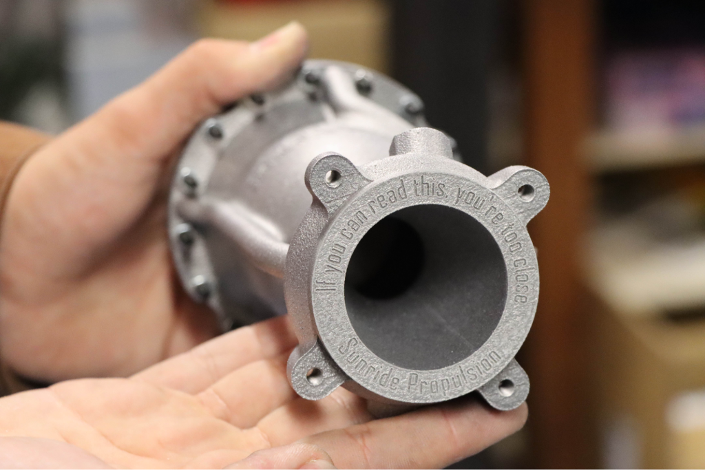 Affectionately known as Baldrick, this engine is designed to fly on our Black Adder liquid rocket, which aims to be the first of its kind to launch from UK soil. It uses nitrous oxide and IPA to produce 1.25 kN of thrust and is cooled through innovative spiral cooling channels. It is made of an AlSi10Mg aluminium alloy, additively manufactured by our sponsor Aconity3D. Sunride is massively thankful to Aconity3D for printing both SF-III engines, SF-IV, and SF-V.
